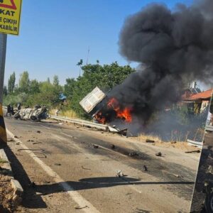 Konya’nın Doğanhisar ilçesinde Ahmet K. idaresindeki tır, Kuz Mahallesi çevre yolunda İsmail A. idaresindeki otomobille çarpıştı.