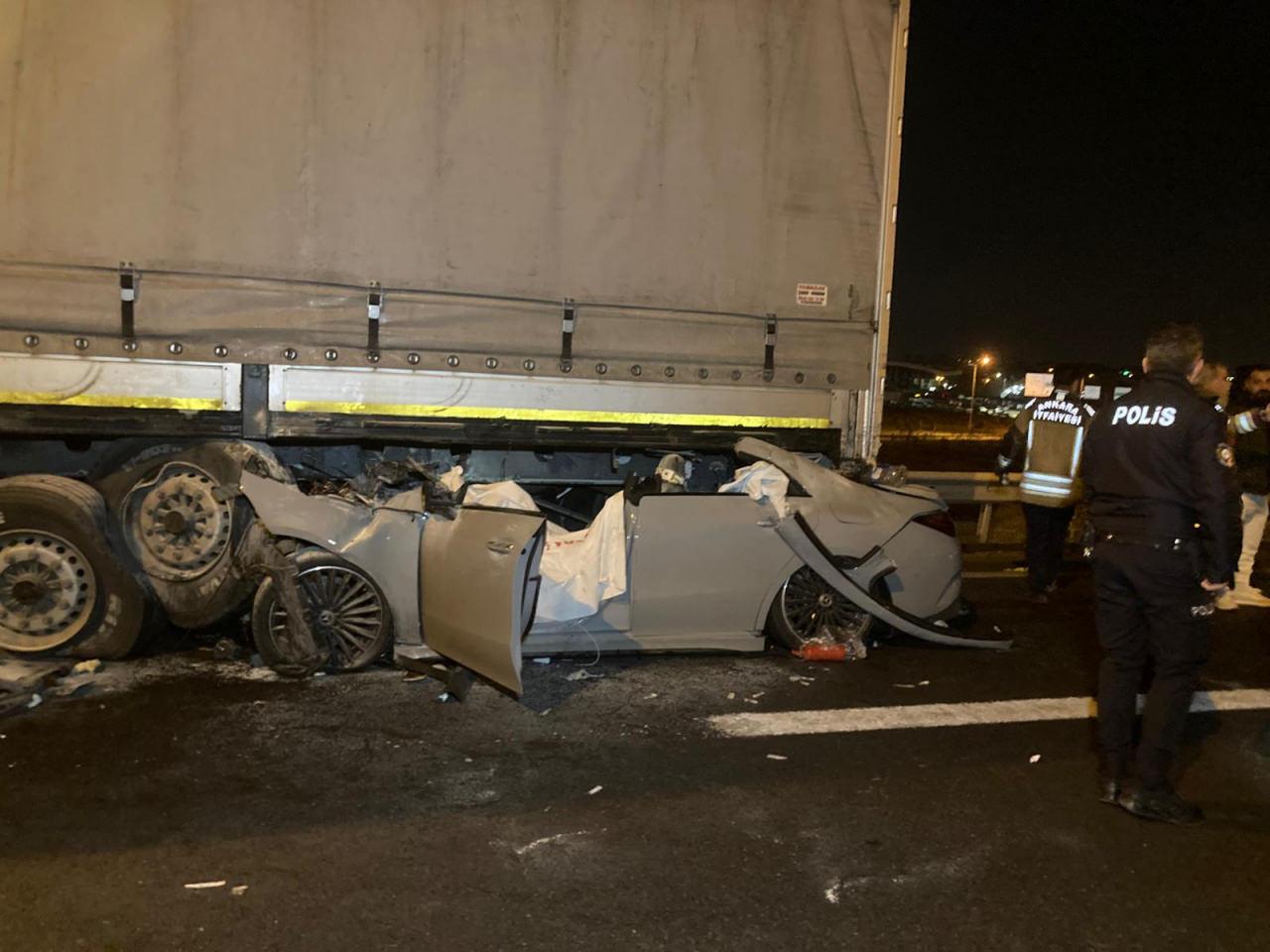 Çarpışmanın şiddetiyle otomobil, TIR’ın dorsesinin altına sıkıştı. Çevredekilerin ihbarı üzerine olay yerine sağlık, itfaiye, polis ve karayolları ekipleri sevk edildi. Sağlık ekiplerinin yaptığı kontrollerde demir yığınına dönüşen otomobildeki sürücü B.K ve yanındaki E.D.’nin hayatını kaybettiği belirlenirken, kazada ağır yaralanan M.C. ise ambulansla Sincan Devlet Hastanesi’ne kaldırıldı.